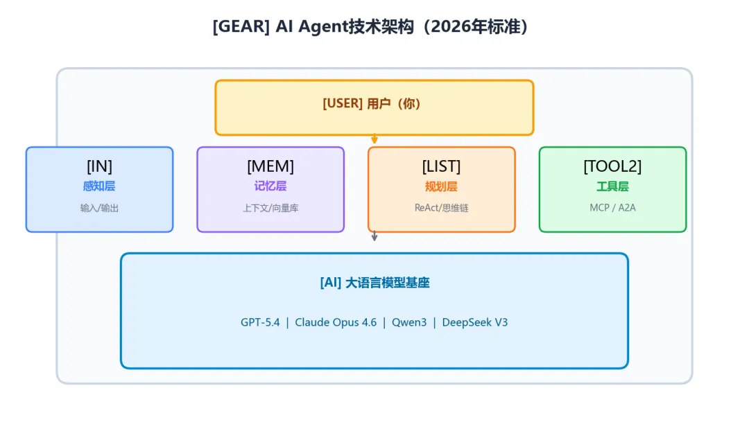 图4:AI Agent技术架构(2026年标准)— 感知层/记忆层/规划层/工具层
