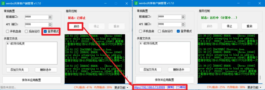 按需选择文件类型:文件夹、图片、视频、文档、安装包、压缩包等,支持批量多选,启动后,软件自动生成连接二维码+局域网地址