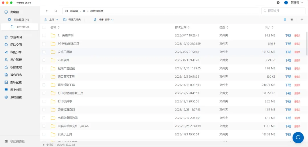 浏览器打开局域网地址后,呈现如下图片。其他设备打开后可以自由下载,速度不限速,还是非常快的。软件支持管理某个设备访问指定文件夹;同时电脑之间还可以自由聊天。