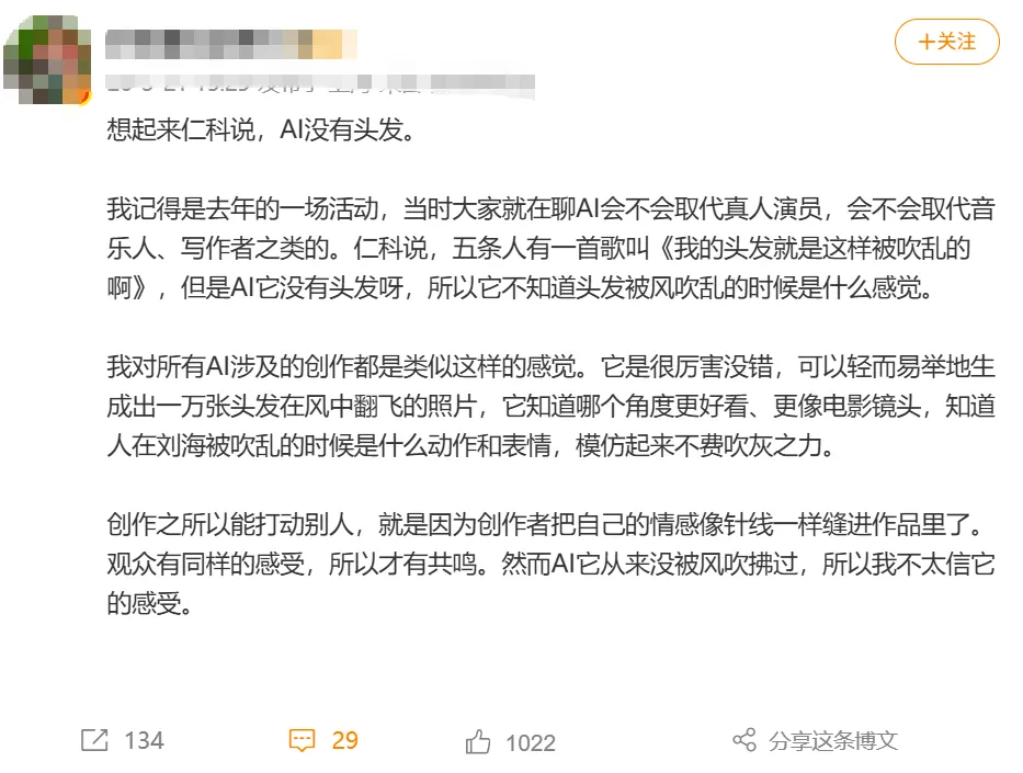 之前大家都在争论,AI会不会取代歌手、画家、作家、演员等。五条人乐队的仁科说了一段独特的思考: