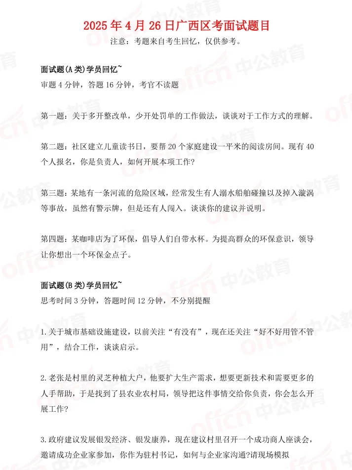 从往年时间来看,广西公务员面试将会进行统一面试,面试地点为所报考的地市。重要提醒‼️面试分公共面试和专业面试。公共面试由自治区公务员主管部门统一组织,由各市公务员主管部门和自治区级招录机关(以下称“面试实施机关”)具体实施。公共面试按照分类分级原则,面试试题分为3类,《计划表》中机构层级为自治区级、市级的综合管理类职位(简称“A类职位”)使用A卷,《计划表》中机构层级为县级、乡镇级的综合管理类职位(简称“B类职位”)使用B卷,《计划表》中的行政执法类职位(简称“C类职位”)使用C卷,《计划表》中的合并职位(不含行政执法类职位)按较高的机构层级确定试卷类型。参考往年的分类分级题目来看,出题形式比较抽象,思考时间短,专业度要求上也更高。对考生有要求知识储备度大,时政敏感度高。以往考情,广西区考面试形式以结构化为主,抽选部分岗位为无领导小组讨论。