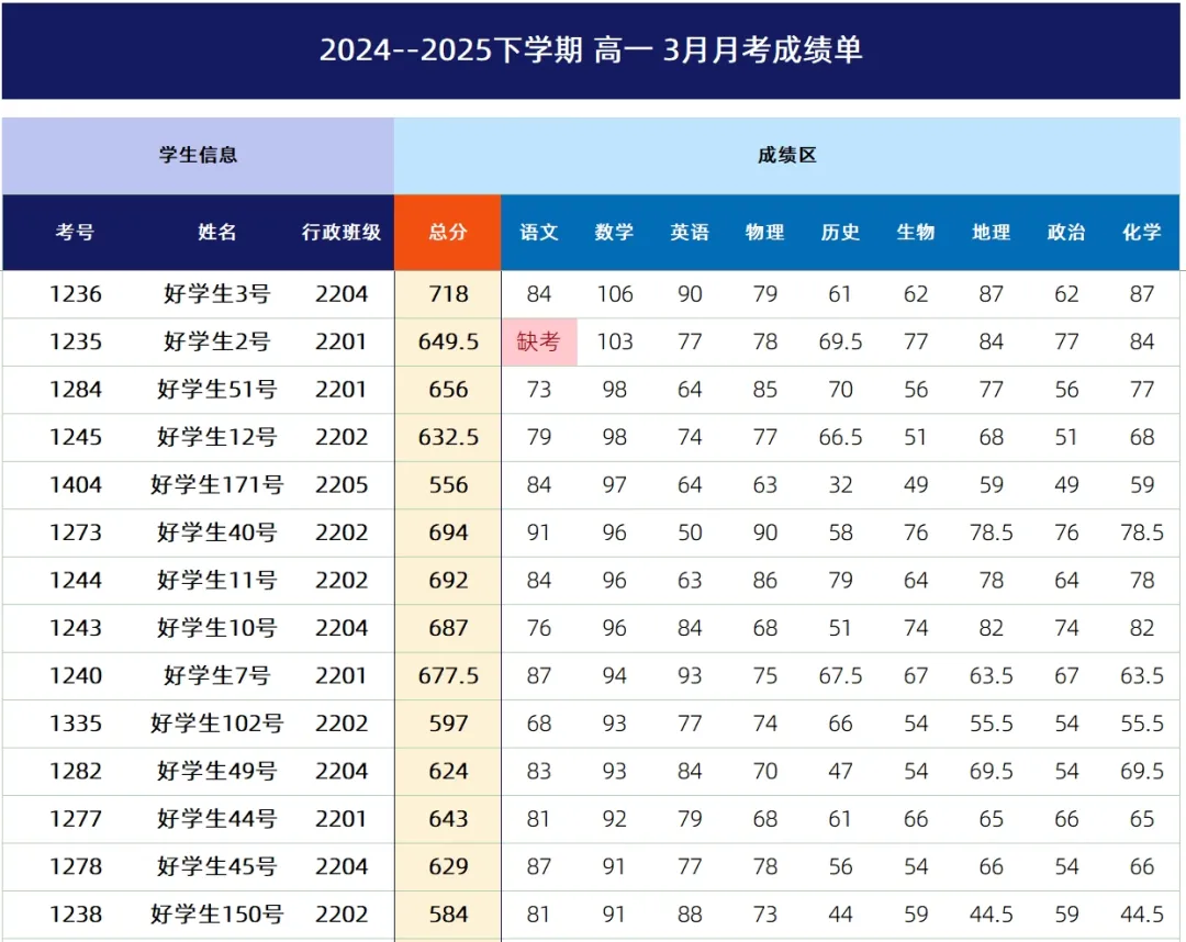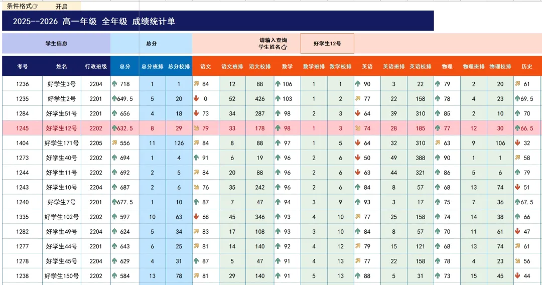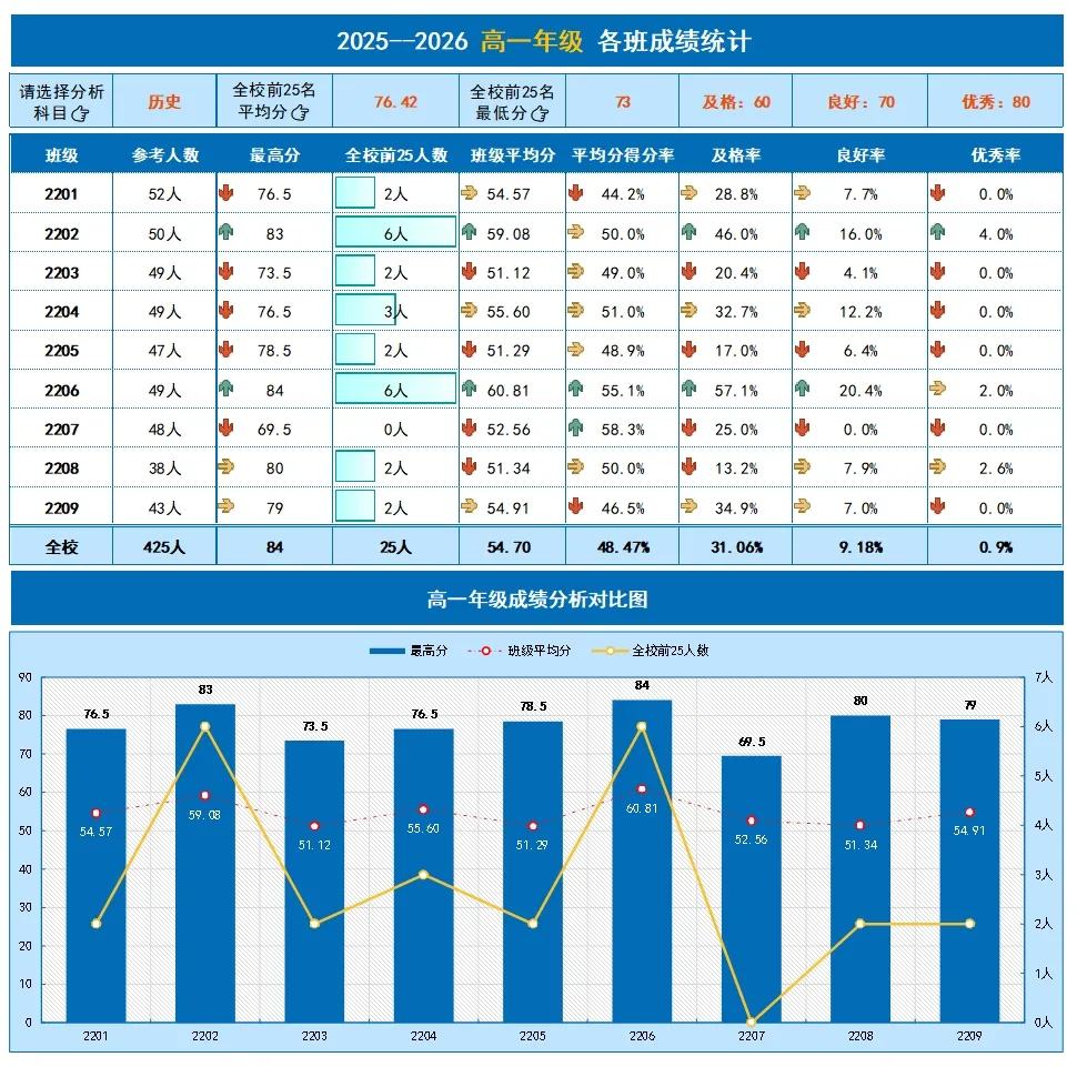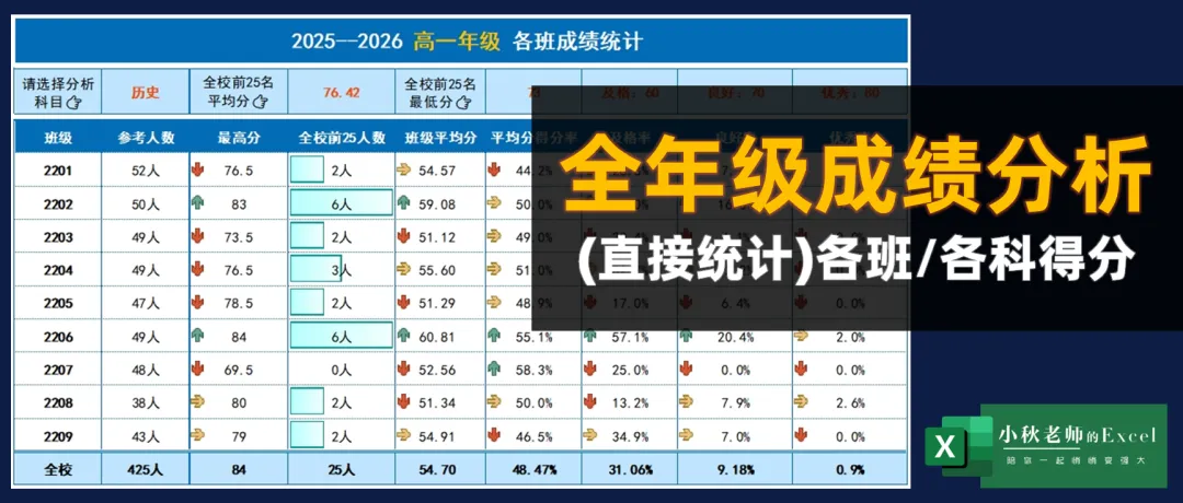 Excel全年级成绩统计与分析(最高分\平均分\优秀率\良好率\及格率)最近后台询问「成绩」分析模版的比较多,尤其是关于全年级成绩各班教学质量统计与分析。因为每次考试结束之后,整理全年级所有学生的成绩单确实是太繁琐了,如果能有一份搭建好的模版,直接录入数据就可以动态提取,直接用于成绩统计分析,该有多好希望【成绩🔍】系列能帮到你 #陪你一起悄悄变强大ps:现开通VIP可学习所有系列&下载模版了解VIP👉通用VIP会员上线,所有课程免费学全年级成绩单统计与分析一、【模版介绍】模版类型:全年级成绩统计分析 适用范围:• 全年级所有班级考试成绩单统计整理• 学校各种考试(周考、月考、期中考、期末考试等)• 可直接提取学生年级排行榜及班级排行榜• 可直接统计分析全年级各班考试成绩ps.模版仅能分析本文介绍内容,若希望添加其他内容,可沟通私人定制,定制费用500元起。模版下载:本模版在【成绩】系列,章节09点击了解👉如何学习?如何下载模版?模版包含:(一)得分统计(各班教学质量分析:最高分、平均分、平均率、优秀率、良好率、及格率)(二)成绩分析(所有学生,各科班排与校排)(三)成绩录入(四)科目明细模版特点:• 模版:Excel直接编辑,WPS可用• 数据提取:函数公式提取(无需刷新)• 学生人数:无限制,100人或1000+人均可• 分析科目:模版内9科,若少于9科,删除即可• 「得分统计」统计内容:根据不同科目(含总分)选择进行所有班级得分情况统计各班参考人数、最高分、全校前25名各班人数、各班平均分、平均分得分率、及格率、良好率(新增)、优秀率• 「成绩分析」统计内容:每名学生成绩、各科班级排行榜&年级排行榜• 「科目明细」:用于各科满分记录,及格、良好、优秀分提取(ps.模版较复杂,视频教程可参考)图表配色:主题配色:蓝色空间,支持一键切换其他配色模版字体:黑体模版截图:教学质量统计(可任意选择科目)成绩分析成绩录入二、【本期视频】(本期视频4:51秒) 已关注 关注 重播 分享 赞 视频详情 ps:开通VIP可学习所有系列&下载模版👇点击👇“阅读原文”进入『成绩』系列