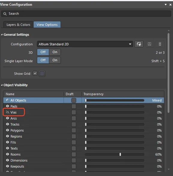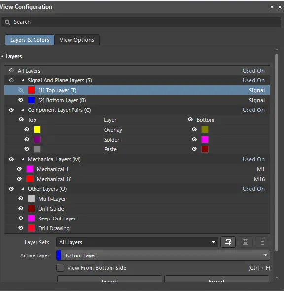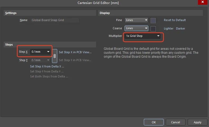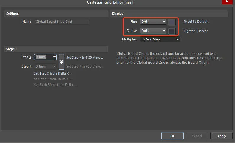 2.Ctrl+H,将连接在一起的线一起选中,对改图和检查走线都很有用如下图所示,Fine、Coarse都选择Lines,Step X、Step Y都选择0.1mm,Multiplier 键入1x Grid Step,标识网格距离为0.1mm。注意设置好后要先单击Apply,再单击OK结束对话框。如果想把网格的距离改为0.5mm,Multiplier 键入5x Grid Step,如下图所示:如果想把网格改为点状,Fine、Coarse都选择Dots,如下图所示:4.快捷键L,打开View Configuration对话框:在Layers&Colors界面,可以打开或者隐藏各个图层,如下图所示,已经隐藏了正面走线在View Options界面,可以打开或者隐藏焊盘、过孔等,如下图所示,已经隐藏了过孔运用L快捷键,可以隐藏各图层,LAYOUT时十分有用,做文件截图时也非常方便。绘图软件AD20中常用的4个快捷键,小伙伴学会了吗?如果对你有帮助帮忙点个赞或关注!