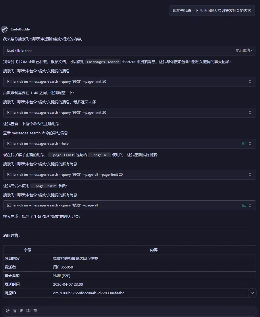 AI 收到指令后,会自己判断需要调用哪个命令、拼好参数、执行、然后读取返回结果。整个过程你不需要告诉它“要用 lark-cli im +messages-search --query "绩效"这个命令”,AI 自己就知道该怎么做。