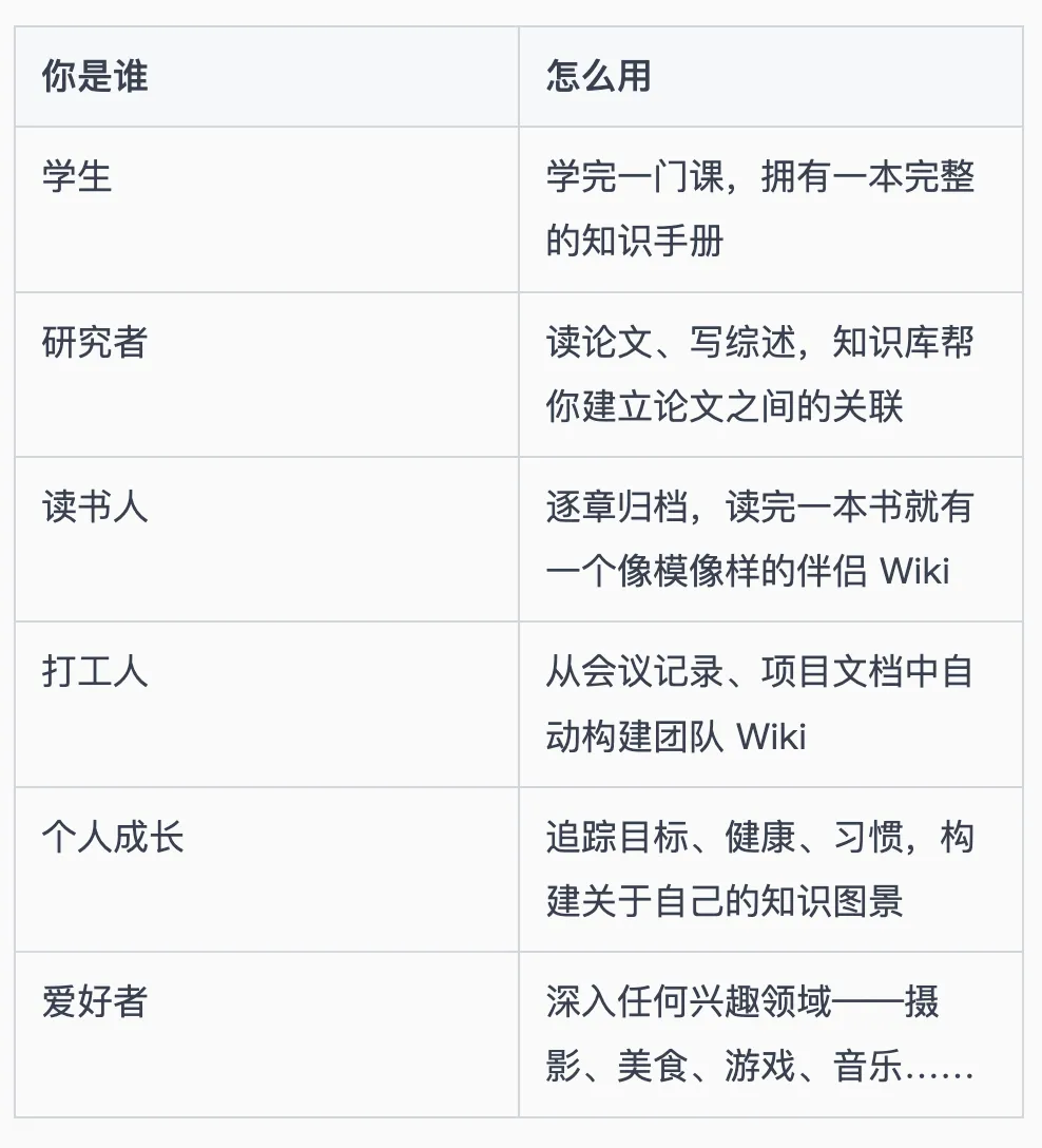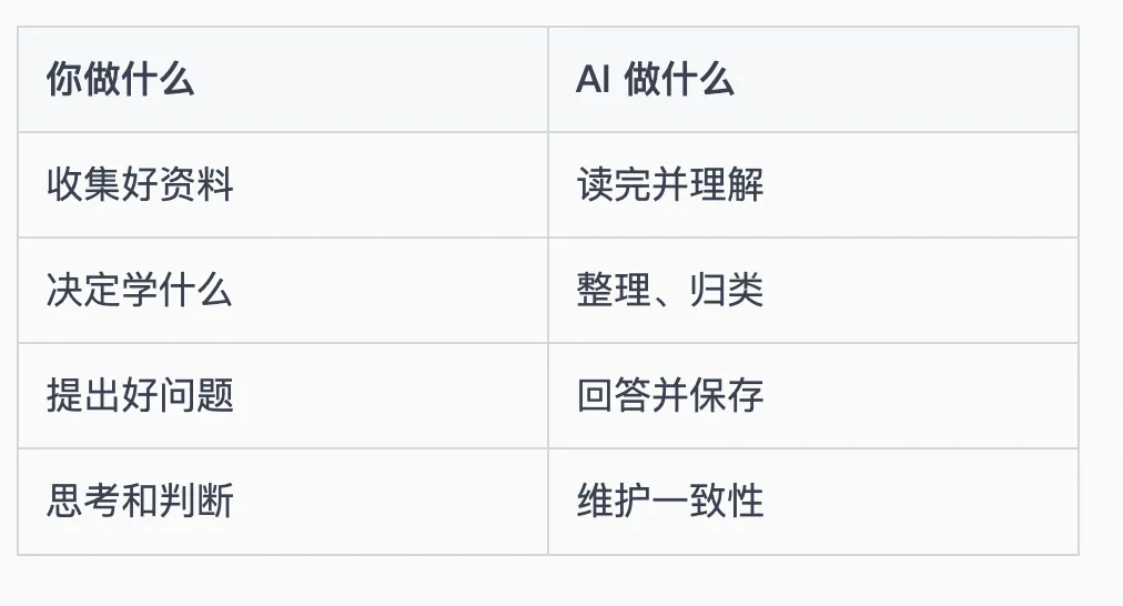 现在流行的 AI 笔记工具(NotebookLM、ChatGPT 文件上传)是怎么解决这个问题的呢?每次你提问,AI 从你的文件里搜一遍,拼凑出答案。这有个致命问题:AI 每次都要从头搜,什么都没记住。让 AI 先把你的资料“编译”成一个结构化的知识库,之后你直接用就行。- 旧方式:你想知道一道菜怎么做,每次都从头翻整本食谱