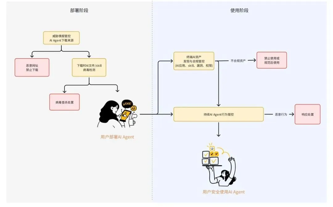 AI Agent 在解放双手的同时,也撕开了企业终端安全的隐秘伤口 —— 私自部署、公网暴露、凭证裸奔、供应链投毒,每一项都足以击穿企业安全防线。