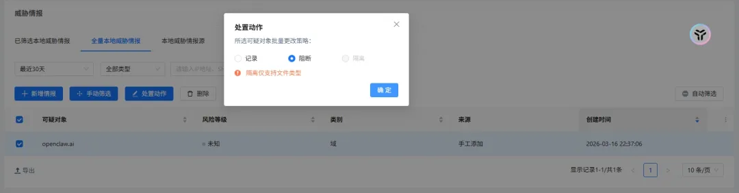 全局威胁情报进行封禁,终止禁止用户访问 OpenClaw /其他AI应用的下载官网并进行应用下载。