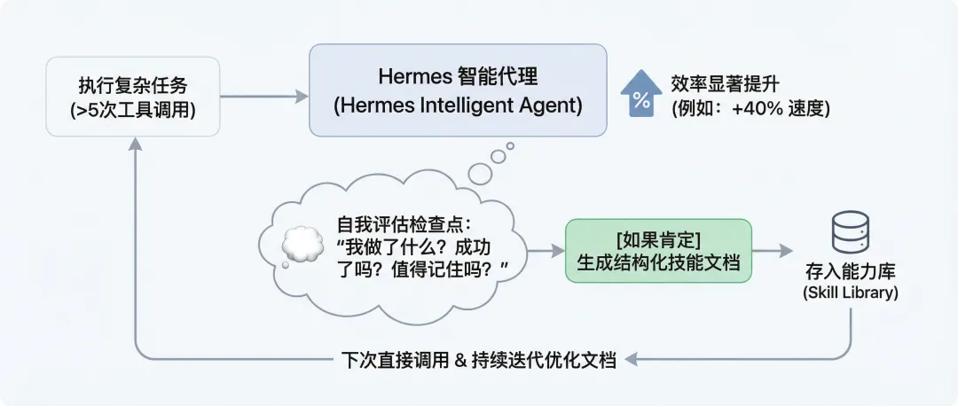 根据社区用户的真实反馈,当 Hermes 在两小时内自动生成了三份技能文档后,处理同类重复性研究任务的速度直接提升了百分之40。
