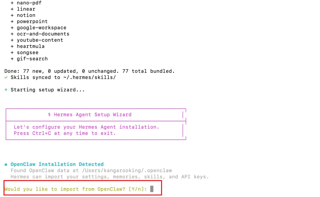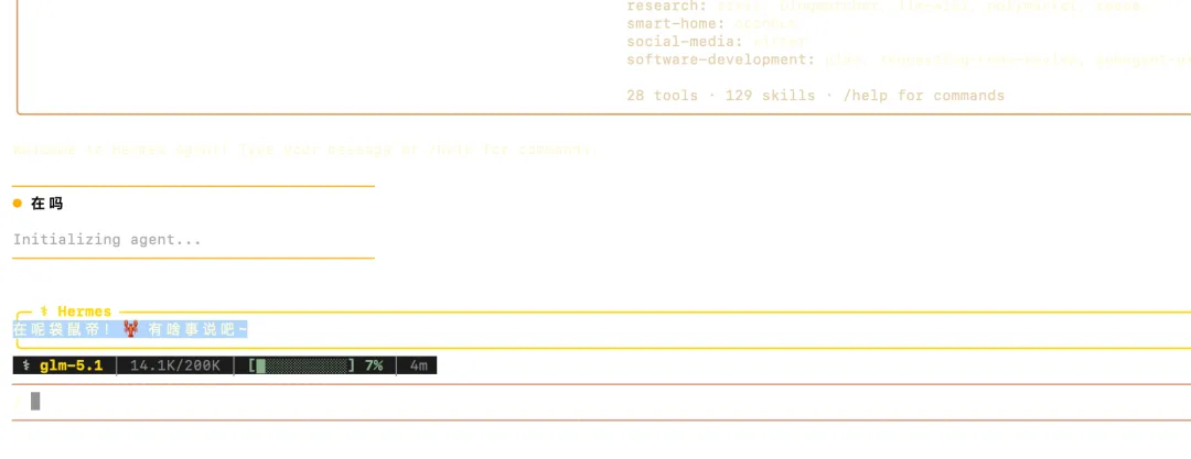 curl -fsSL https://raw.githubusercontent.com/NousResearch/hermes-agent/main/scripts/install.sh | bash1分钟左右就能完成全部安装。