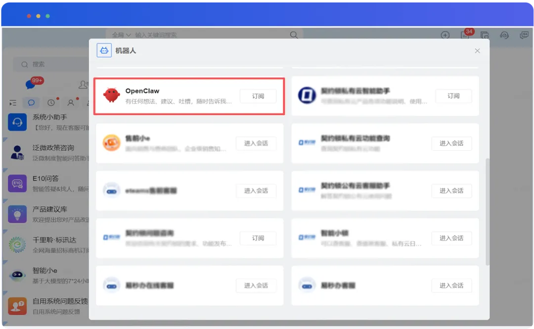 第二步:在易秒办订阅机器人。在易秒办PC端的“机器人中心”,订阅“OpenClaw机器人”,将OpenClaw的能力以机器人形式接入易秒办平台。