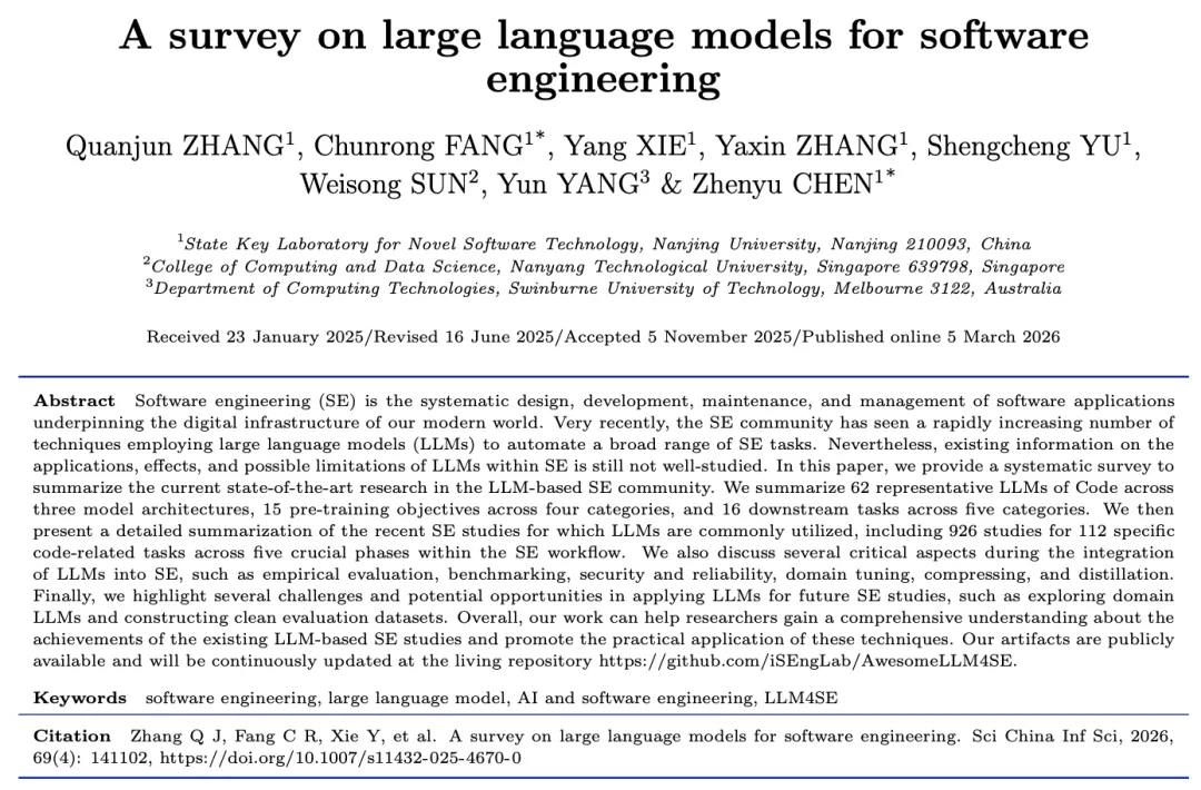 本文主要基于南京大学陈振宇老师的团队最新发表的综述论文:A survey on large language models for software engineering(涵盖了对988项研究、62个代表性代码大模型以及112个软件工程任务的全面分析),并适当结合我和王千祥老师写的著作《软件工程3.0:大模型驱动的研发新范式》,从AI视角、软件工程任务视角以及AI与软工融合的新范式视角,深入探讨大模型驱动软件工程的当前现状、实证成果及未来展望。