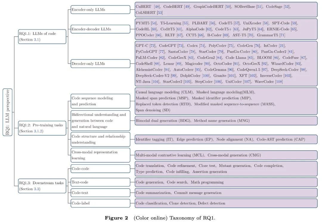 从人工智能的视角来看,大模型为软件工程提供了强大的“智能底座”。论文系统梳理了62个代表性的代码大模型(LLMs of Code),其演进历程和技术架构呈现出清晰的发展脉络。