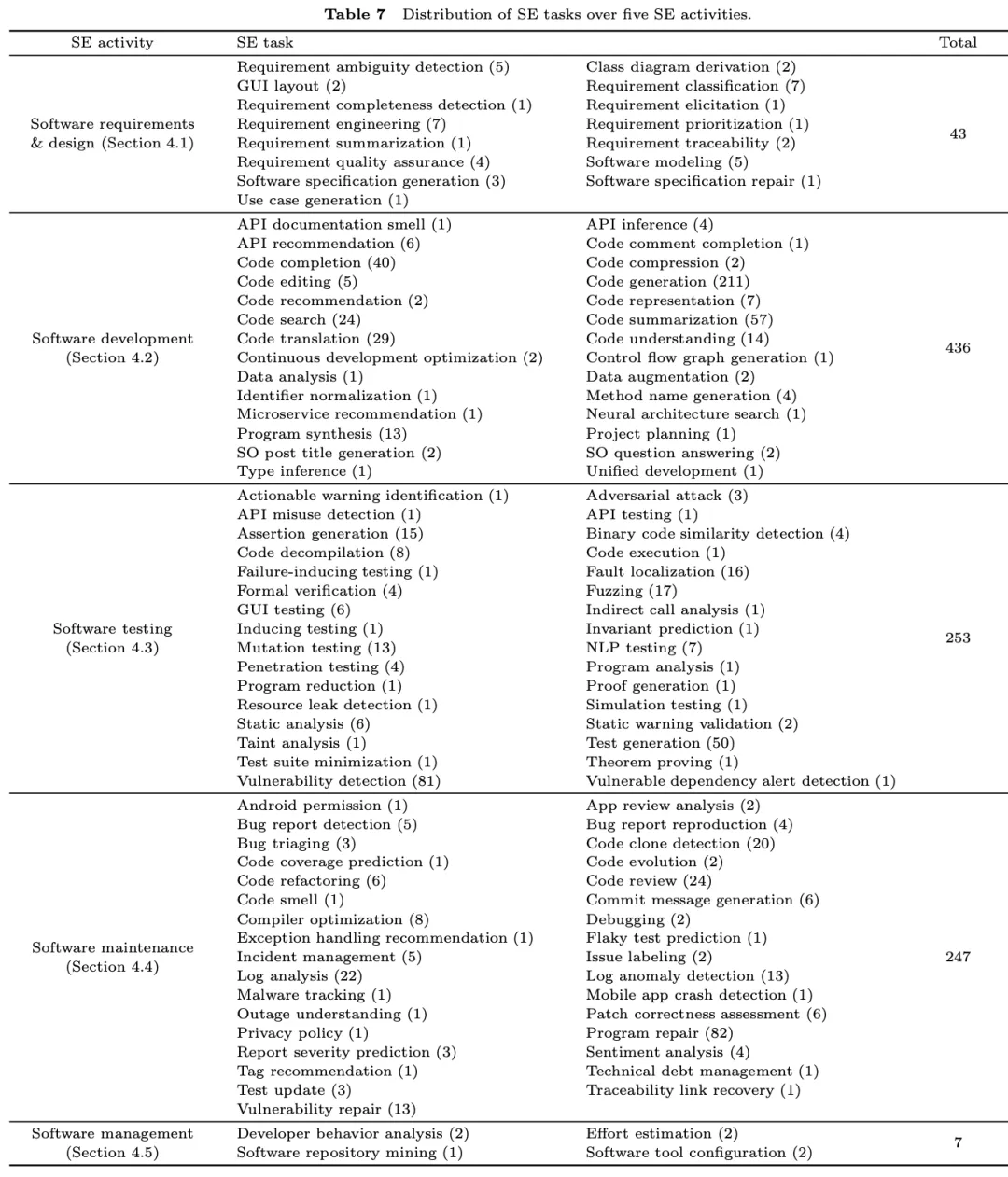 如果说AI提供了智能的“大脑”,那么软件工程的各个任务则是具象的“躯干”。大模型并非仅仅是一个高级的“代码补全工具”,而是已经全面渗透到软件生命周期的五大关键阶段,覆盖了综述中统计的多达112个细分任务。