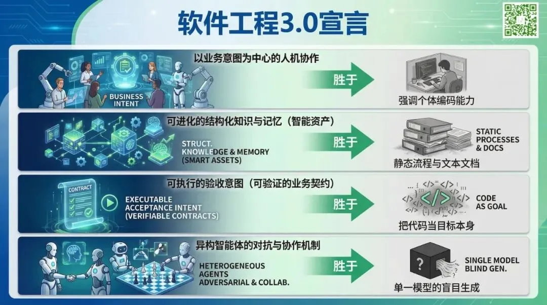 正如我与王千祥老师在《软件工程3.0:大模型驱动的研发新范式》一书中所指出的:软件工程正从以流程控制为核心的1.0时代、以敏捷和持续交付为特征的2.0时代,跨越式地迈入以大模型为引擎、以“模型驱动研发”为核心的3.0时代。这一得到最近几年实践验证的理论愿景,在本次综述论文汇总的广泛实验成果中,得到了完美的逻辑映射与实证确证。