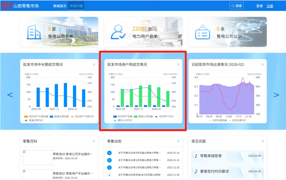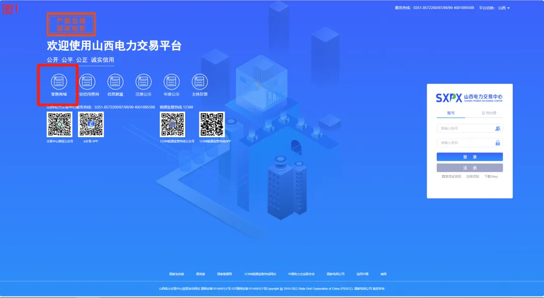 打开“山西电力交易平台”首页(图1),点击顶部导航栏的【零售商城】,进入零售市场页面(图2)。