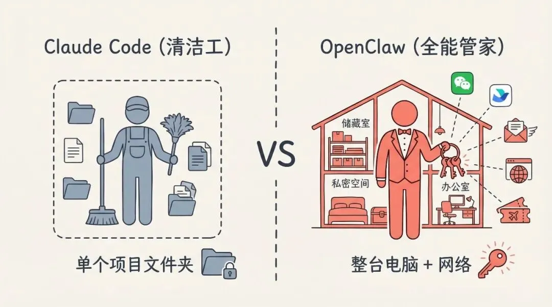 第一点是权限不同。网上有新闻说,有人在安装 OpenClaw 的时候,一不小心安装在错误的位置,结果所有文件都被清空了。从那以后我就学乖了。Claude Code 更像是你指定项目文件夹的一个清洁工。你告诉它这个文件夹下的代码应该怎么改,它只动这个文件夹下的东西。就算搞砸了,你也可以通过 Git 回退;或者即使没有 Git,最多也只是搞废这一个项目。OpenClaw 完全不同,它拿到的是整台电脑的万能钥匙。好处是能力很强:帮你回消息、发邮件、订机票、查账单,自动打开网页操作。坏处是:如果权限控制没做好,它能把你电脑里珍藏的一切直接删除,或者删掉系统文件让电脑搞崩。它的破坏力类似于病毒或木马。所以网上很多人专门买了一台 Mac mini 跑它。常用的主力电脑,我建议最好别装。说白了,OpenClaw 并不安全。但反过来说,权限大它能做的事情也更多。你为了图方便给它更多的钥匙,这也是理所应当的事。