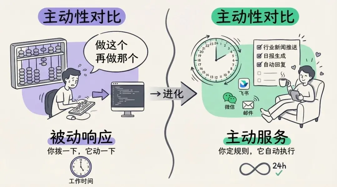 说完了权限,再说说主动性。权限代表这两个工具能做什么,主动性代表什么时候做。OpenClaw 的主动性非常强。它通过"定时心跳",就像人的心跳一样,每隔一段时间跳动一下,来主动检查当前要处理的任务。你可以安排它每半个小时看一眼你正在做的事情:检查工作状态、催促进度、帮助解决问题。这种随时陪伴的主动性,是 Claude Code 解决不了的。Claude Code 的逻辑是"拨一下动一下"。你必须坐在电脑面前给它下达指令,它才会执行。它没有"定时任务"这个概念。当然,你可以通过安装插件让 Claude Code 实现定时任务,但这在本质上与 OpenClaw 的实现方式不同。如果你想让它每天早上把行业新闻发到飞书里,这种场景下,OpenClaw 更像是一个 24 小时待命的管家。正因为这一点,才有这么多人"喂龙虾"、"养龙虾"。它的主动性是之前所有 AI、以及那种一句话一句话聊天的 ChatGPT 方式所不具备的。