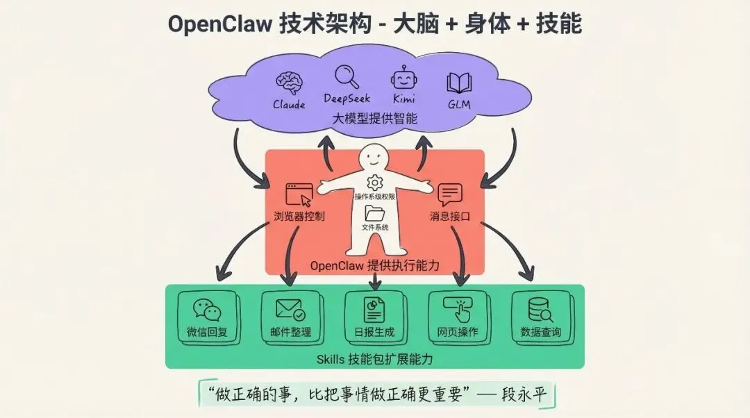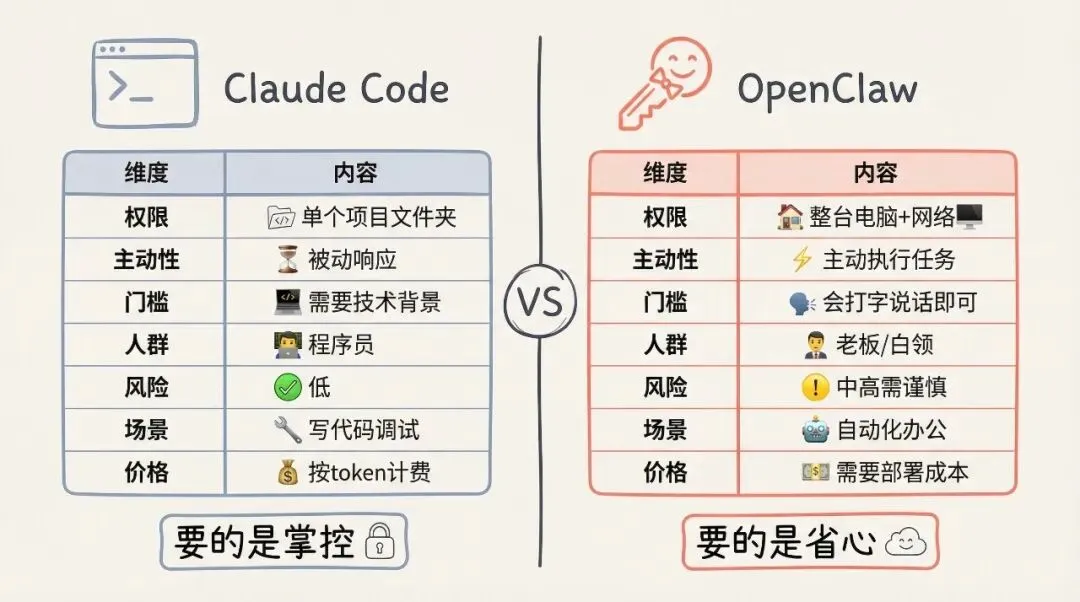 OpenClaw 刚出来的时候,我没把它当回事。说实话,作为一个长期编程的程序员,我用 Claude Code 已经有很长一段时间了。在我眼里,Claude Code 本身就是一个大模型加上一堆工具的组合。OpenClaw 看起来也是同样的东西,不就是通过聊天工具来控制代码吗?套个壳而已。后来 Claude 团队给 OpenClaw 发了律师函,这事反而让我更确定了判断:他们确实是一回事,至少在官方眼里是这样。但事情的发展超出了我的预料。这东西火得一塌糊涂。我本来不想试的,但周边的朋友都在用,就自己尝试着用了三天。不用不知道。这三天的体验让我发现,虽然技术上看起来跟 Claude Code 没什么差异,但使用场景和人群完全不同。我把这些想法整理出来,方便大家了解。