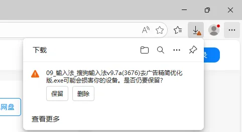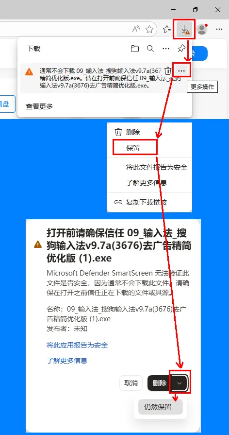 关闭Defender SmartScreen保护后,再次点击下载,应该能正常保存文件了。但某些版本的Edge浏览器可能还会显示以下的确认选择,选“保留”即可,真够烦人的。