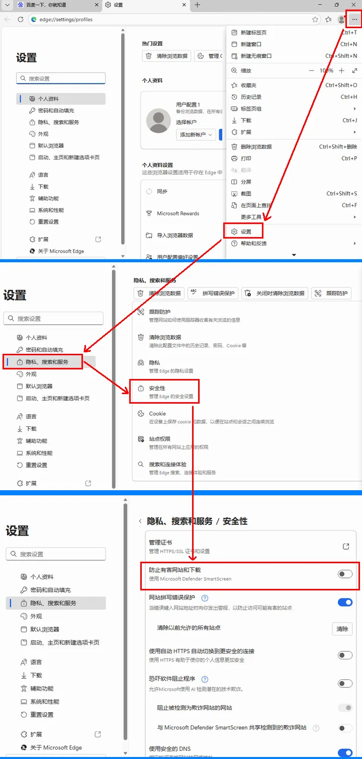 此时可尝试关闭Defender SmartScreen保护。首先打开浏览器设置,然后依次选择“隐私、搜索和服务”——“安全性”,最后将“防止有害网站和下载”选项关闭即可。下图为其详细操作步骤演示: