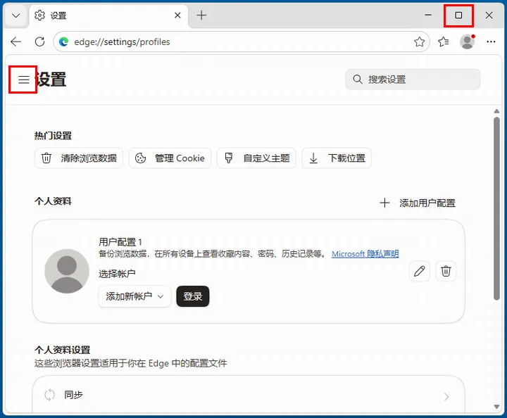 2.如打开浏览器设置后为下图所示的样子,不显示左侧的设置菜单。这是因为浏览器窗口被缩小导致的,只需将浏览器缩放为最大就会出来了。