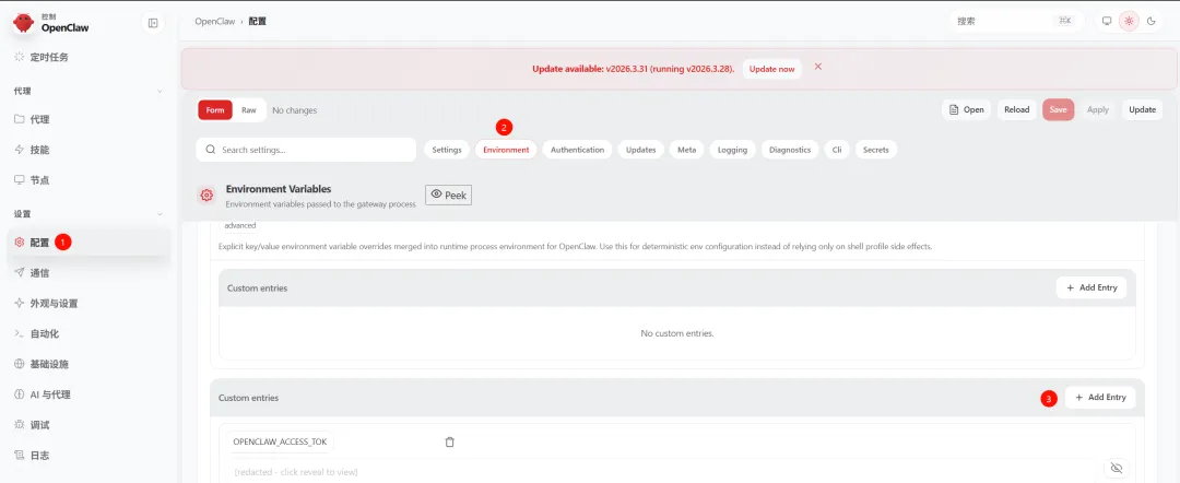 上面这种配置形式,其它程序也可以调用,如果环境变量只在openclaw中使用,则可以在openclaw的配置菜单下进行添加,如下图。