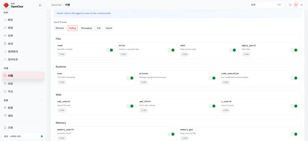 多个智能体应按照智能体当前的功能规划来分配权限,比如写作助手,就不应该分配执行命令的权限,这个可以在Openclaw的代理栏下的Tools下进行配置,它默认提供了几个分类,有Minimal最小权限,有Coding编程的,也有Full所有的,也可以根据自己需求去进行单独的开启和关闭。