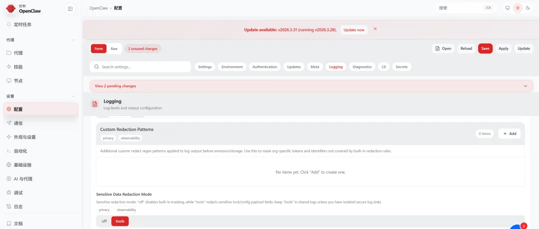Sensitive Data Redaction Mode:自带的脱敏规则,tools选项代表工具参数、密码、key等场景的敏感信息,会脱敏后再存入日志。