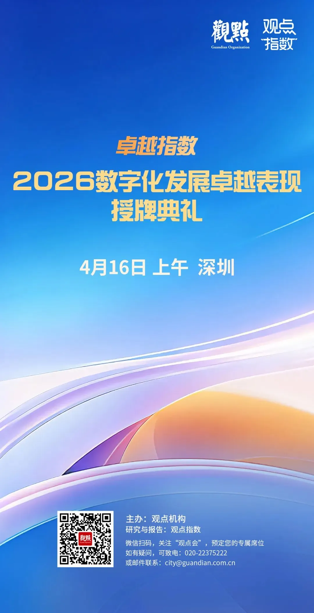 在政策引导、技术驱动、需求响应的多重背景下,为汇聚行业智慧、分享实践经验,推动数字化技术在不动产领域的深度落地,观点机构将于4月16日上午在深业上城城市云客厅举办2026观点数字科技未来大会,观点指数研究院将在现场重磅发布《卓越指数 • 2026 数字化发展卓越表现报告》以及系列研究成果。