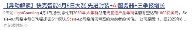AI算力“超级大动脉”!光模块+CPO双领域,不容忽视的4大王者企业!光模块及CPO技术正成为支撑数字经济高速运转的关键核心。并且根据LightCounting报告显示,2030年AI集群光互连产品年销有望达1000亿美元,Scale-out每GPU最多需6个光模块,Scale-up带宽约为前者10倍。并且2026年4月,A股光模块与CPO板块迎来爆发式行情。4月8日,光通信模块板块涨幅达5%,成交突破1558亿元。中际旭创创历史新高,市值突破7400亿元;铭普光磁、东山精密、剑桥科技涨停。在这样的背景下,本期主要梳理一下A股光模块和CPO封装领域的4大核心公司。1.天孚通信