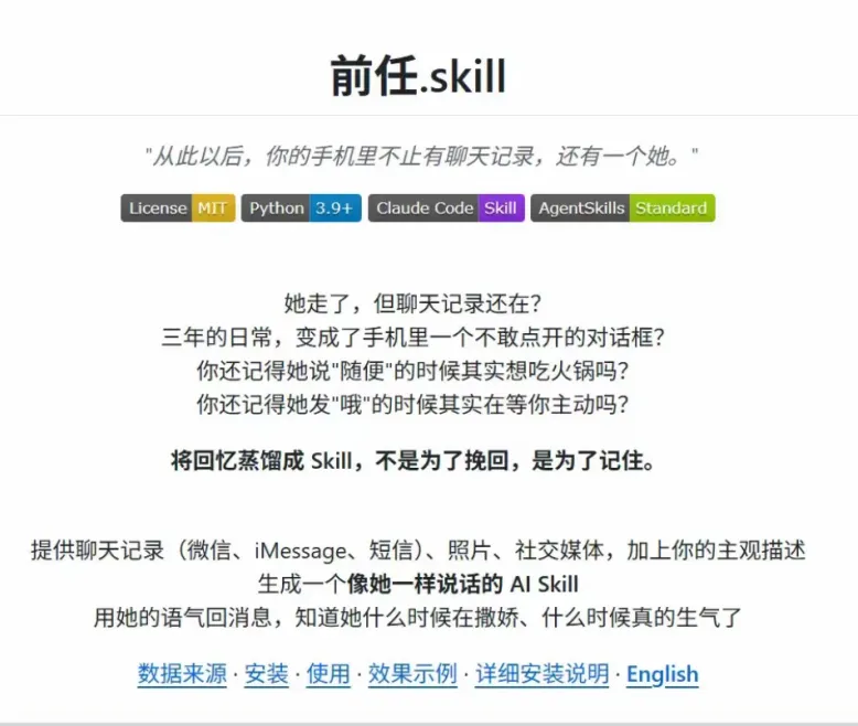 GitHub(一个存放软件代码的网站平台)最近爆火的.skill项目便是提供了这么一项技术:将你想复刻的对象的聊天记录、照片等所有相关的信息,喂给AI,便会生成一个风格、语气都与这个复刻对象一样的数字分身。