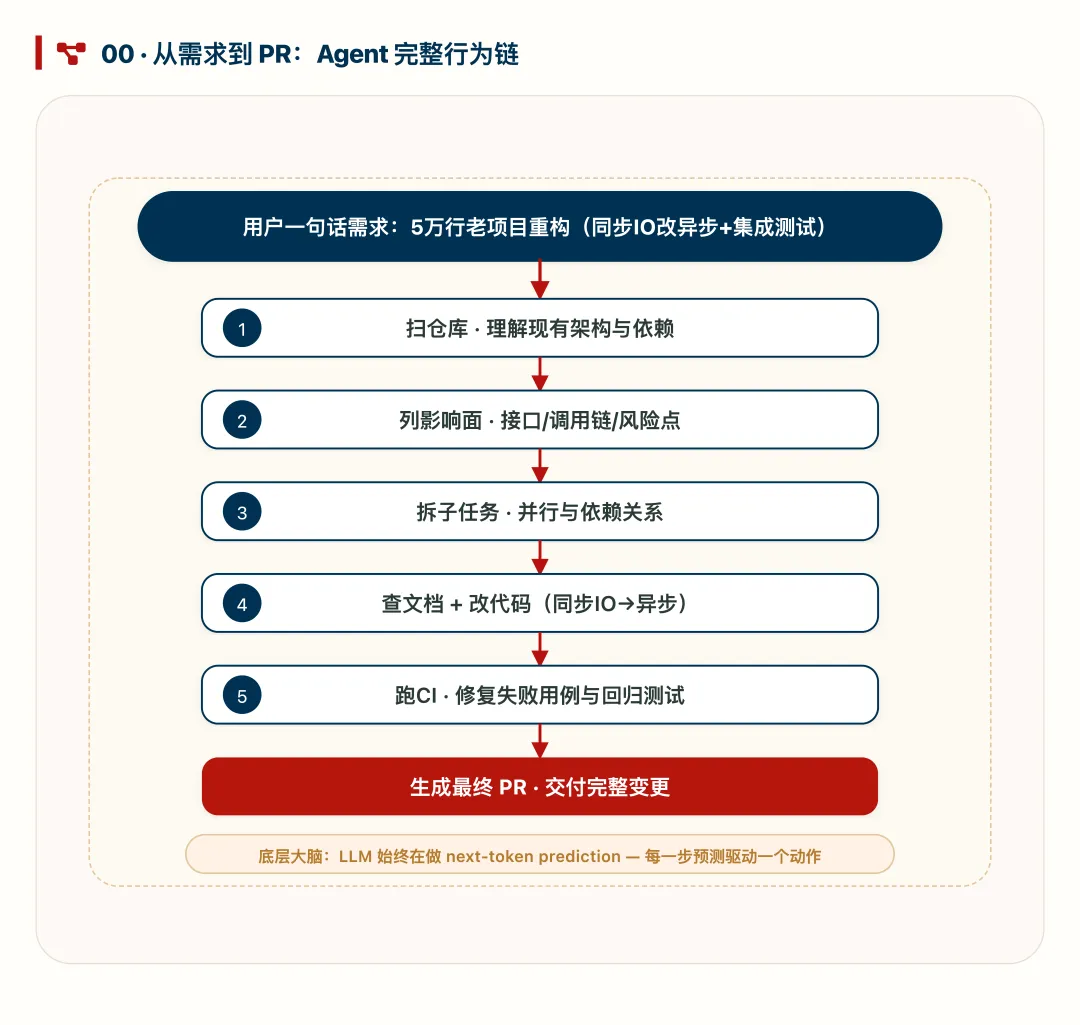 用户给出一句复杂指令,Agent 自动拆解为“扫仓库→列影响面→拆任务→改代码→跑CI→提PR”的完整行为链。每一步都由 LLM 预测下一个 token 驱动,但通过工程闭环,最终表现出了项目经理级的规划与执行能力。