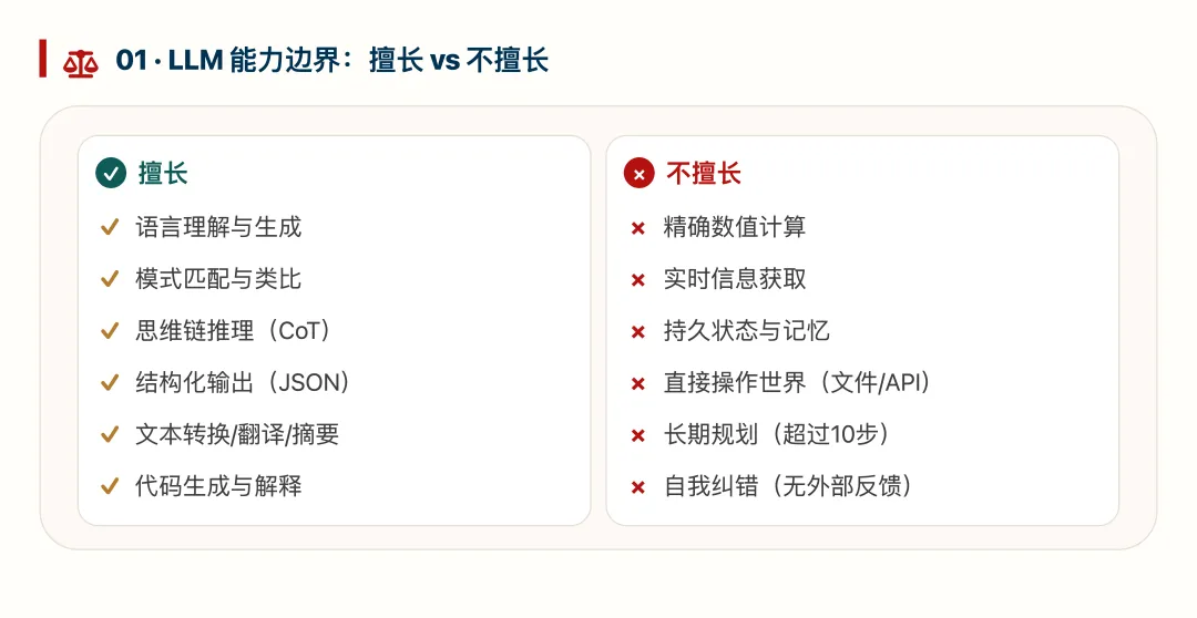 LLM 的核心优势在于语言理解和模式匹配,但它在精确计算、实时信息、持久记忆和直接操作外部世界方面存在天然短板。Agent 的工程层正是为了补齐这些短板:将计算、查询、存储、执行都封装成工具,让 LLM 通过调用工具来间接完成。理解这个边界,是设计 Agent 的第一步。