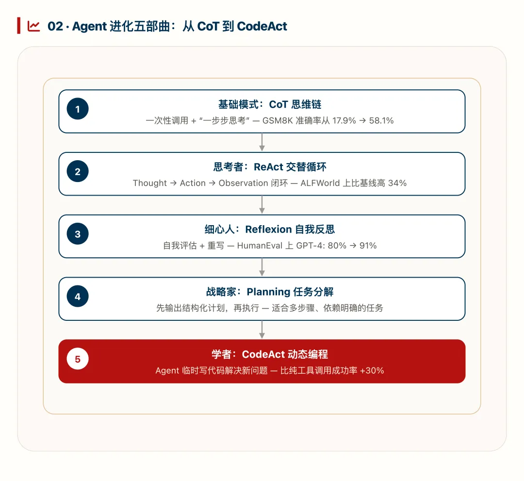 从最简单的 CoT(思维链)到 ReAct 闭环、Reflexion 自我反思、Planning 任务分解,再到 CodeAct 动态编程,复杂度逐级提升。关键数据:Reflexion 让 GPT-4 在 HumanEval 上从 80% 提升到 91%,证明流程设计比模型大小更重要。