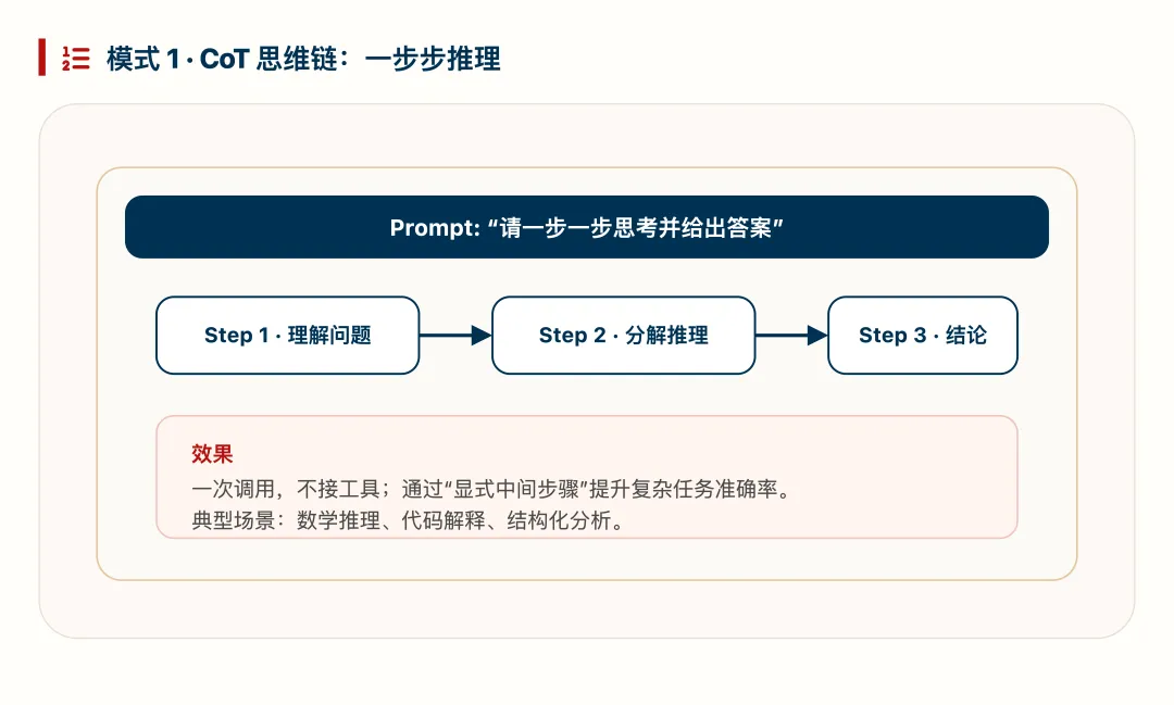CoT(Chain-of-Thought)通过要求模型“逐步推理”,在一次调用内显式展开中间步骤。它实现成本最低,适合作为 Agent 推理增强的起点。