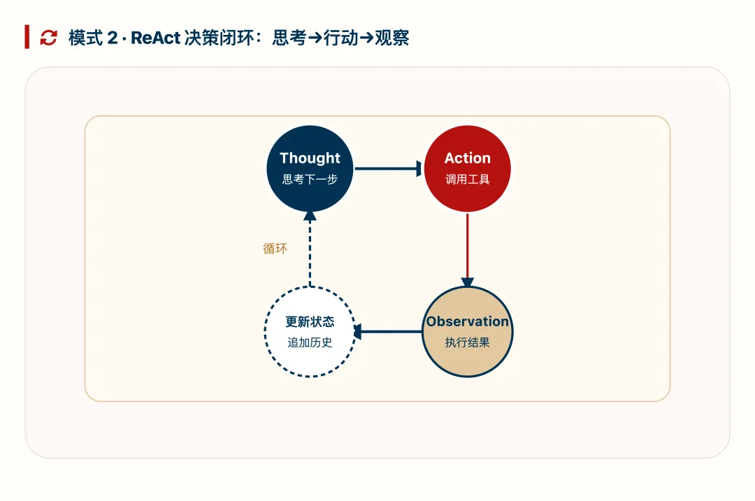ReAct 让 LLM 在“思考→行动→观察→更新状态”之间循环。每次观察(Observation)都为下一步决策提供新信息,逐步降低任务的不确定性。这是 Agent 区别于一次性 Chatbot 的核心机制,也是“从预测 token 到做决策”的直接体现。