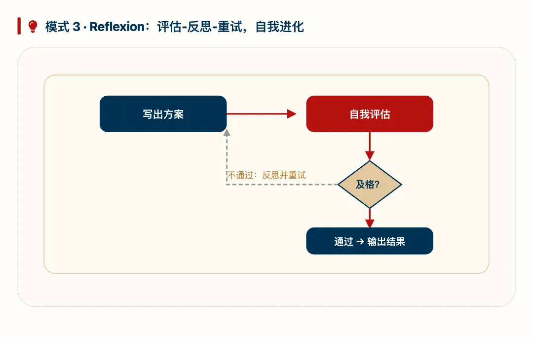 Reflexion 让 LLM 先写出方案,再对自己进行结构化评估。如果不通过,则根据评估中的批评意见修改后重试。在 HumanEval 代码生成任务上,这种方法将 GPT-4 的 80% 准确率提升到 91%。关键在于:同一个模型分饰“写作者”和“评审员”,流程设计放大了模型能力。
