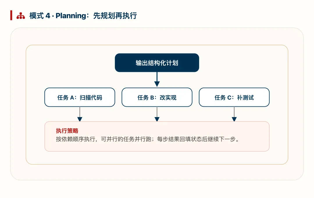 Planning 先让模型输出结构化计划,再按依赖顺序执行子任务。它适合多步骤、强依赖的复杂任务,能显著降低直接执行时的混乱和返工。
