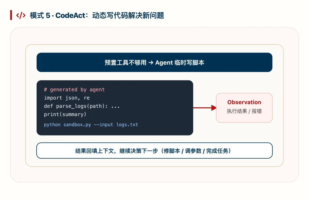 当预置工具覆盖不了问题时,CodeAct 允许 Agent 临时生成并执行脚本,把结果回填为 Observation,再继续决策。这是处理非常规任务的关键补位能力。