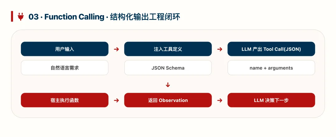 调用链路是:用户输入 → 注入工具定义 → LLM 输出 tool call JSON → 宿主执行函数 → 执行结果回填给 LLM。LLM 本身没有“手脚”,是工程系统给了它行动能力。