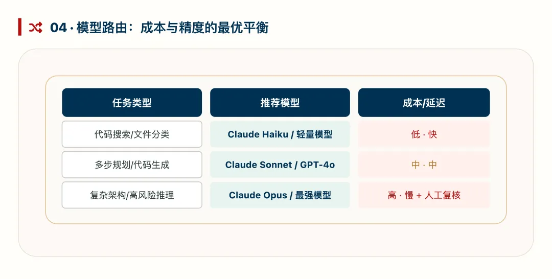 不是所有步骤都需要最强模型。Claude Code 的实践:探索搜索用轻量 Haiku,规划编码用 Sonnet/Opus。这种异构架构每月可节省数十万美元 API 费用。研究表明,正确的模型路由可以在性能损失不到 1% 的情况下降低 60% 的成本。