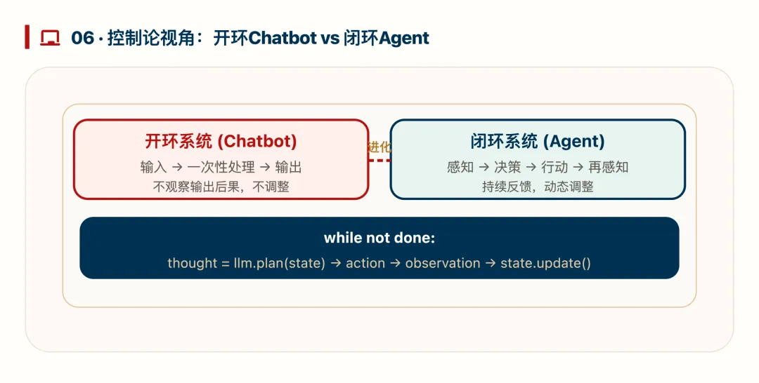六、控制论视角:开环 Chatbot vs 闭环 Agent