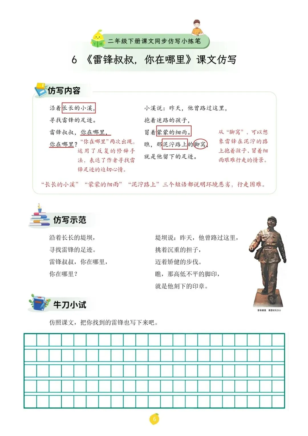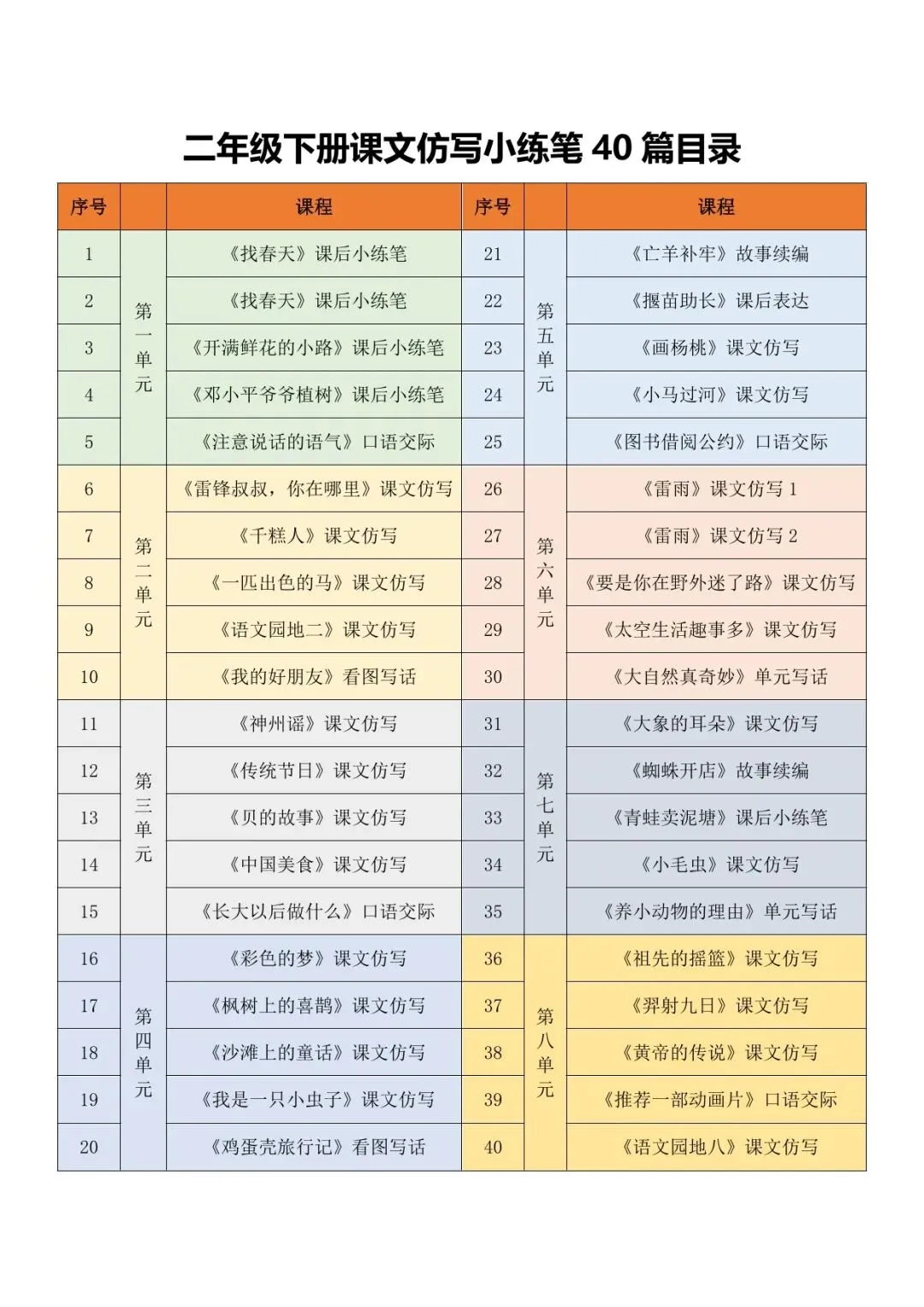 本资料同步部编版二年级下册语文教材,选取课内经典篇目设计仿写小练笔,内容涵盖写景、写物、写人、记事等常见类型。句式简单、贴近课文、易模仿上手,每篇配有仿写提示,适合课堂练习、课后巩固和作文起步训练,可直接打印使用,帮助孩子快速掌握课文写法,提升写话与表达能力。