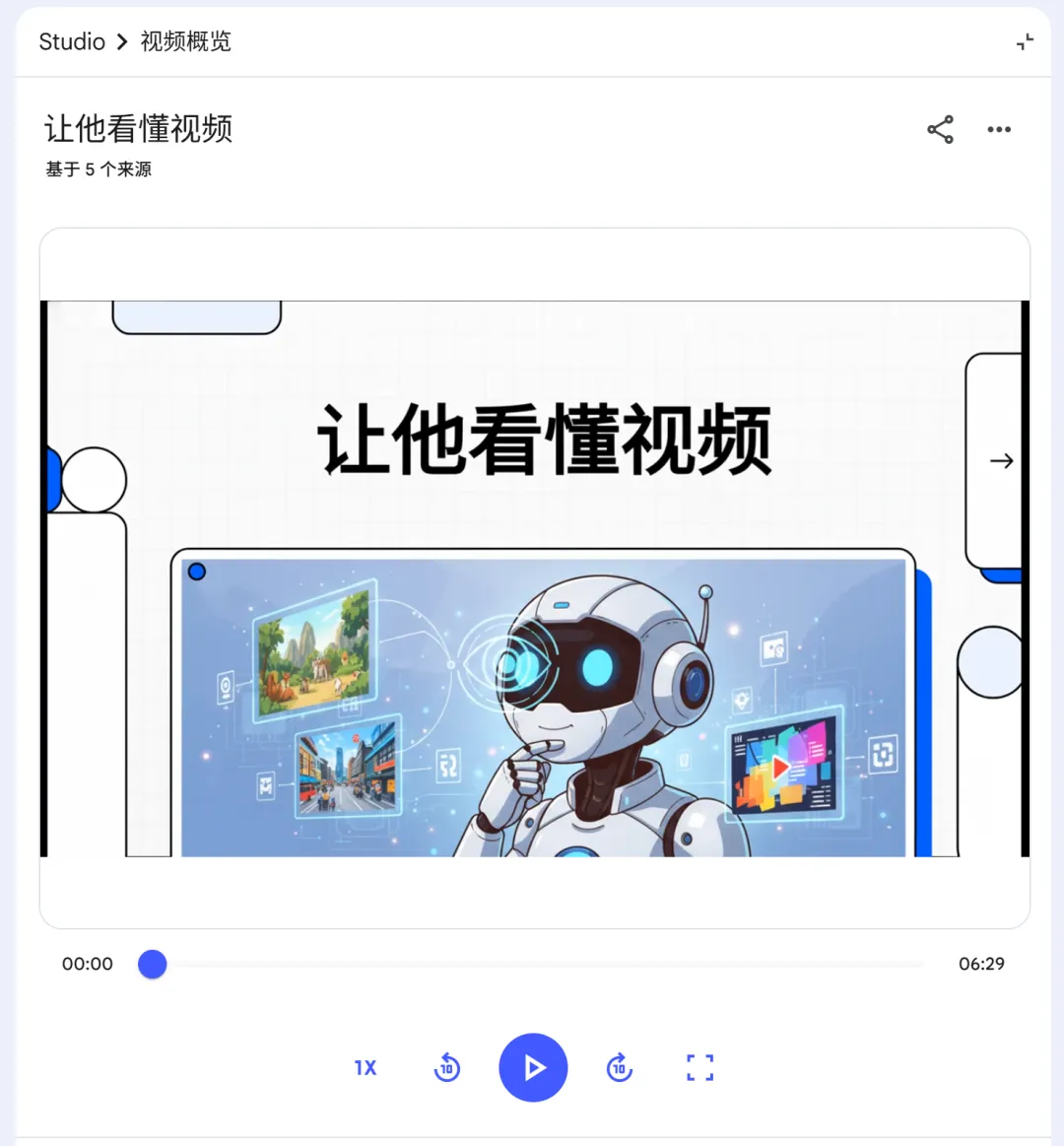 生成的视频叫 "Audio Overview",两个 AI "主持人" 对话讲解你的材料,配背景音乐,像一档播客节目。