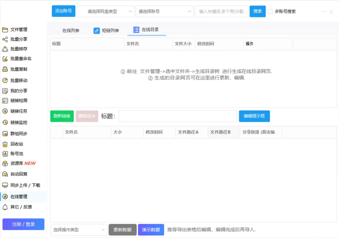 能将不同网盘、不同账号下的文件,生成目录树表格,或者在线目录网页: