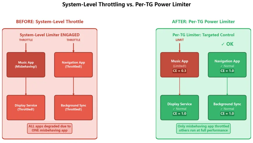图 1:传统系统级限流 vs. Apple Per-TG Power Limiter —— 只有"犯错"的 App 被限制