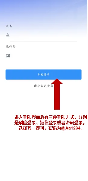 这三种登陆方式分别是刷脸登录、短信登录或者密码登录,考生选择其一即可。刷脸登录需要考生将面部对准手机摄像头,系统会进行人脸识别验证;短信登录需要考生输入手机号码,然后获取验证码进行验证;密码登录则需要输入预先设置的密码,密码为@Aa1234..。无论选择哪种登录方式,都要确保操作的准确性和安全性。