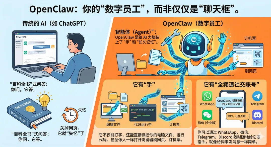 而 OpenClaw 是一个**“智能体”(Agent)。如果说 ChatGPT 是 AI 的“大脑”,那么 OpenClaw 就是给大脑装上了“手”和“长久记忆”** 。