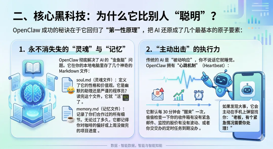传统的 AI 是“被动响应”,你不说话它就睡觉。OpenClaw 拥有**“心跳机制”(Heartbeat)** :