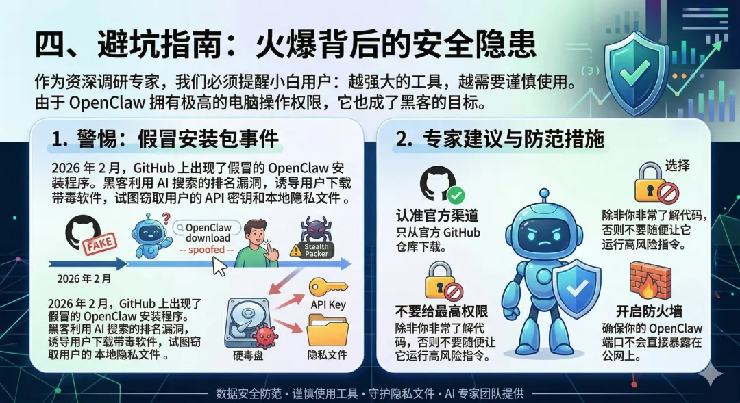 假冒安装包事件:2026 年 2 月,GitHub 上出现了假冒的 OpenClaw 安装程序。黑客利用 AI 搜索(如 Bing AI)的排名漏洞,诱导用户下载带毒软件(Stealth Packer),试图窃取用户的 API 密钥和本地隐私文件 。